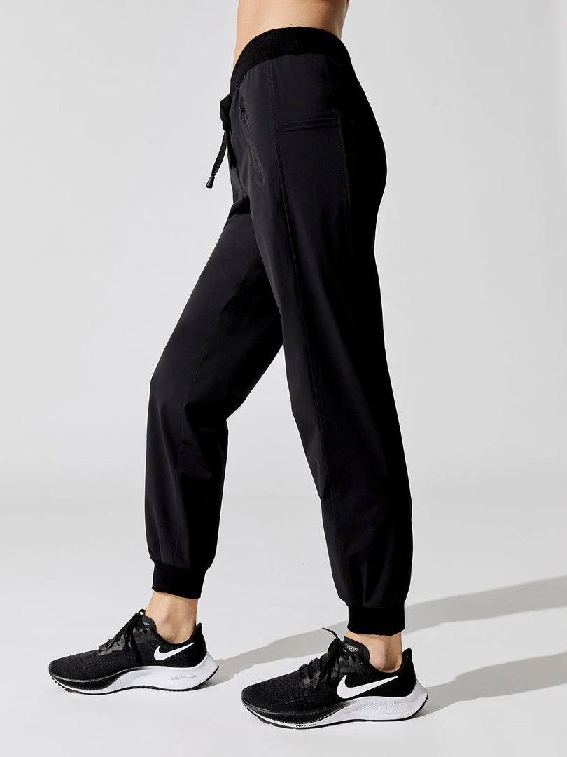 The Original Getaway Jogger from Blanc Noir is an easy-fitting mid-rise trouser featuring front zippered pockets, banded ankle cuffs, and a drawstring at the ponte-knit compression waistband.