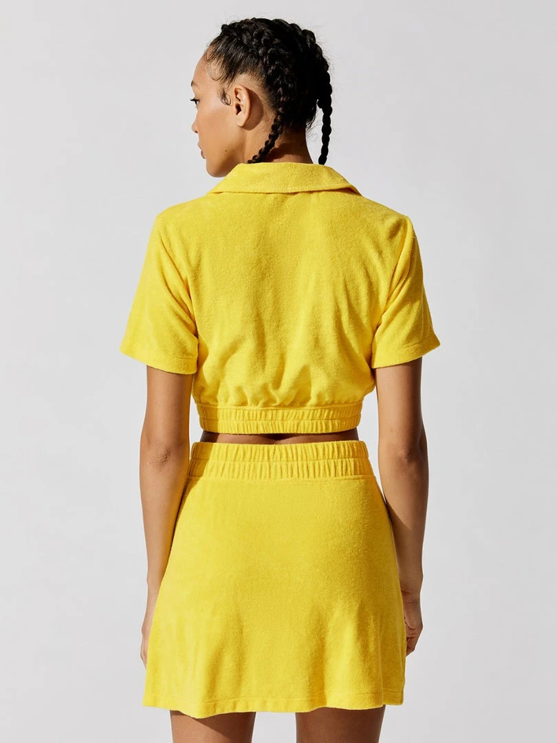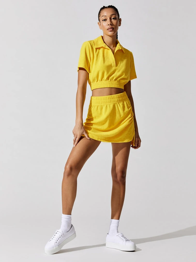 Sweats for summer. The Micro Terry Cropped Top from Carbon38 is a relaxed fit tee with a polo-style collar and an elastic waistband in a short and breezy silhouette. Done in a soft terry fabric in a bright yellow hue.